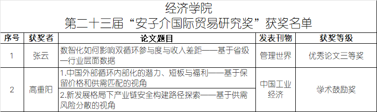 近日,第二十三届“安子介国际贸易研究奖”名单揭晓,永利集团3044官网欢迎您张云副教授撰写的论文《数智化如何影响双循环参与度与收入差距——基于省级—行业层面数据》荣获优秀论文三等奖,学院2022级世界经济博士生高重阳荣获学术鼓励奖。