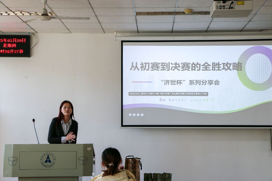 谢可简要介绍了自己的实习经历,从赛事经验、简历撰写技巧到无领导小组讨论的方法,她为同学们提供了宝贵的制胜经验。在总结环节,谢可从形象、实力和心态三个方面总结了大赛技巧,并鼓励同学们积极参与比赛,勇敢面对挑战。她还以自己的比赛经历为例,激励同学们不断提升自我,追求卓越。