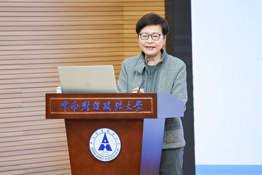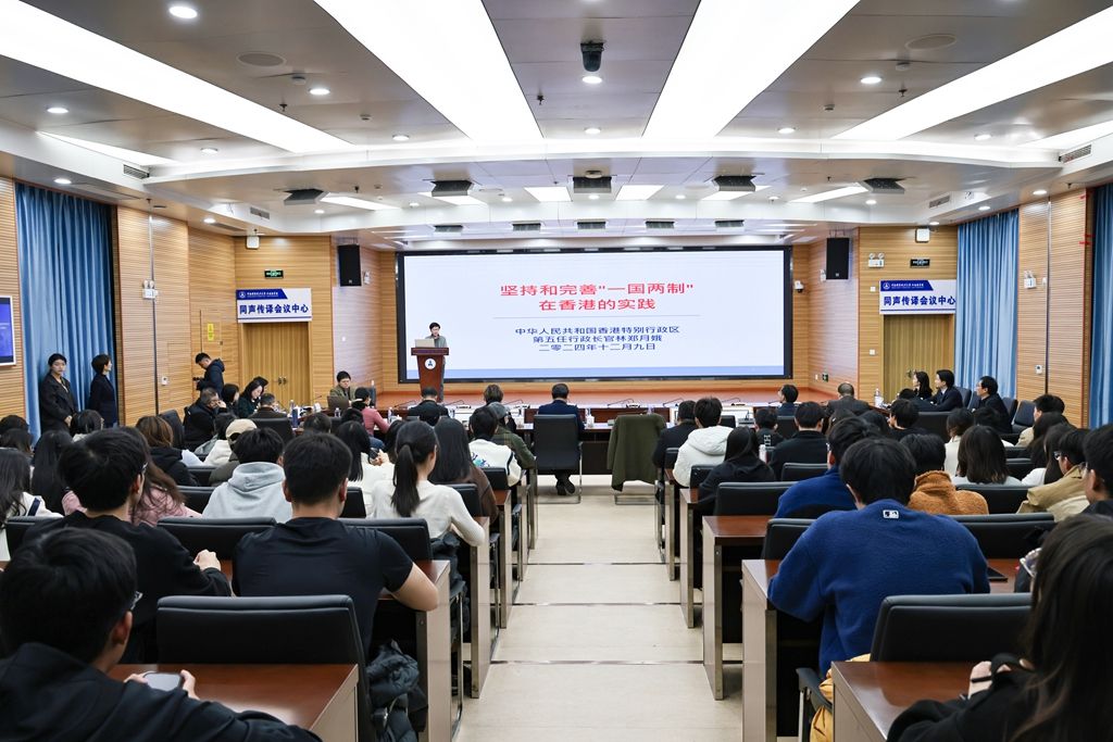 林郑月娥女士作了题为《坚持和完善“一国两制”在香港的实践》的主题演讲。她围绕“一国两制”产生的历史背景和实践历程、香港特区的宪制秩序、特区行政长官的宪制地位、坚持和完善“一国两制”的实践、由治及兴的新征程、打造国际高端人才聚集地等六个方面内容与师生进行了分享与交流。她表示,没有“一国两制”就没有香港今日的繁荣稳定,也就没有香港的未来发展。香港要正确把握“一国”和“两制”的关系,建立维护国家安全法律制度及执行机制,完善特区选举制度、落实“爱国者治港”,推行有利于全面准确贯彻“一国两制”的措施。面对机遇与挑战并存的新局面、新未来,香港要始终坚持“一国两制”原则,依托背靠祖国、联通世界的显著优势,巩固并提升香港国际地位,发挥法治及司法权独立、普通法应用优势,提升传统经济领域的动力,积极发展新产业,应对气候变化,拓展国际与内地联系、提高香港枢纽地位,用好中央支持,全力推动粤港澳大湾区发展,更好融入国家发展大局。