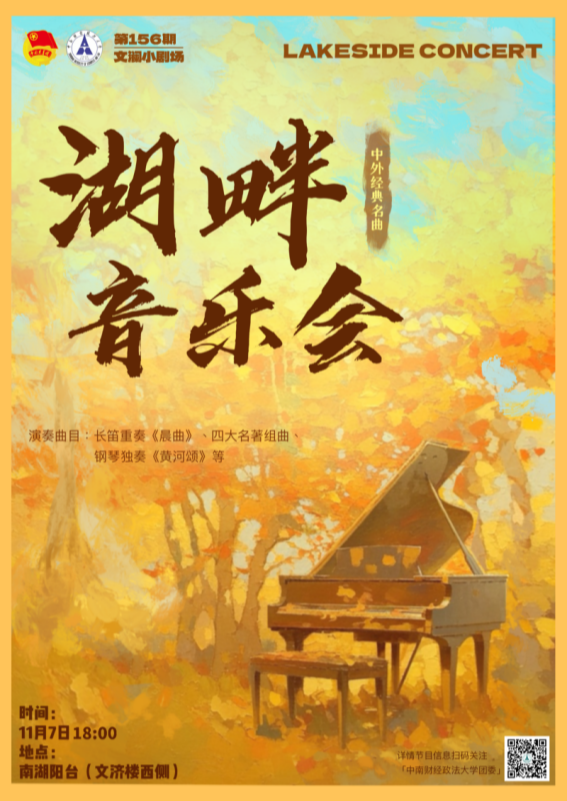 为全面贯彻党的教育方针,落实立德树人根本任务,以美育浸润学生,全面提升学生文化理解、审美感知、艺术表现、创意实践等核心素养,丰富学生的精神文化生活,特举办第156期“文澜小剧场”——“湖畔音乐会”。